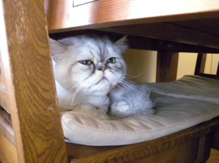 ボクは、やすみます。 テーブルのした。