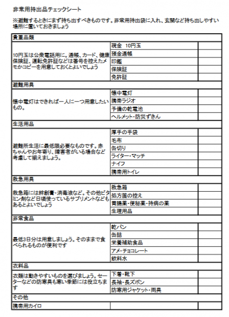 ⑵非常用持出品チェックシート