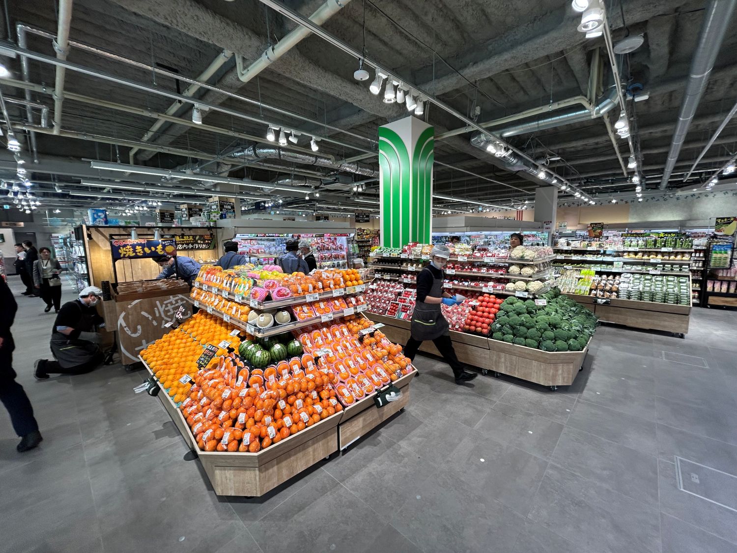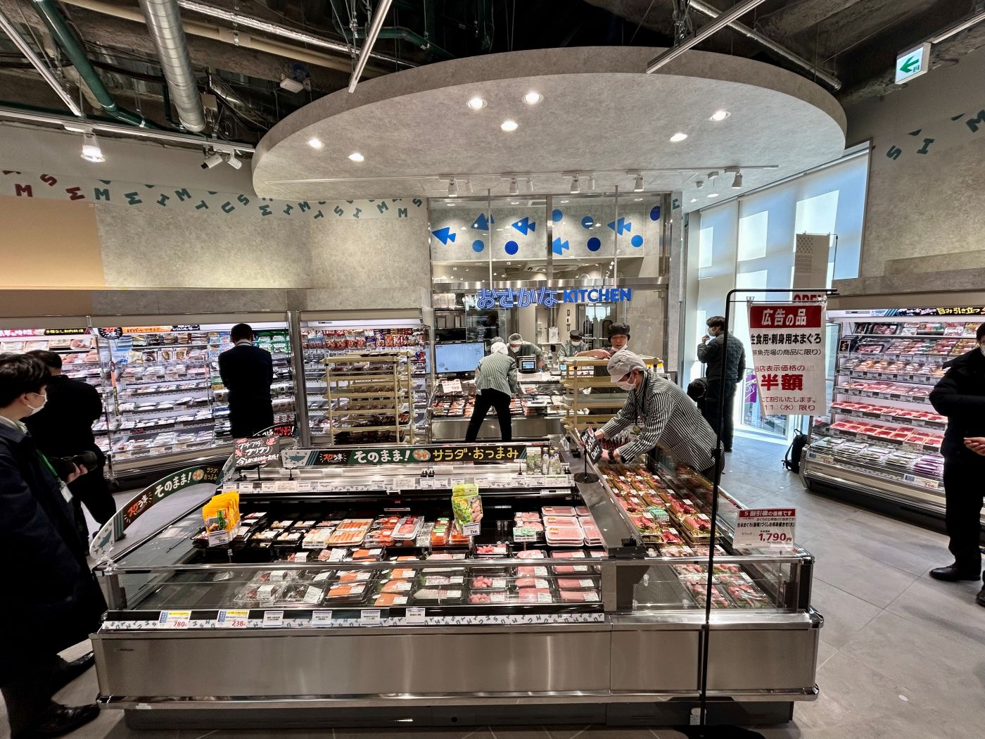 2階に青果、鮮魚、精肉、