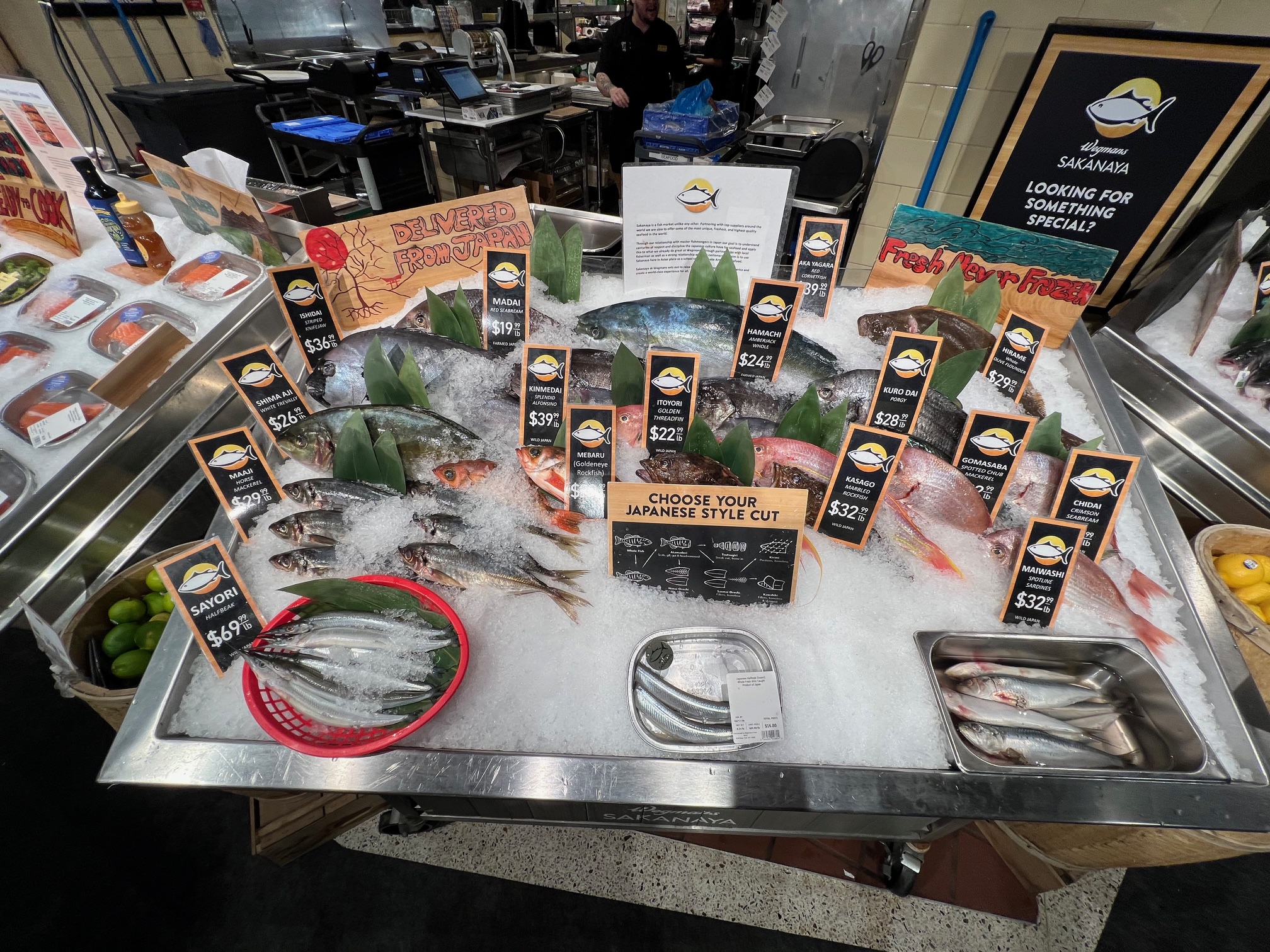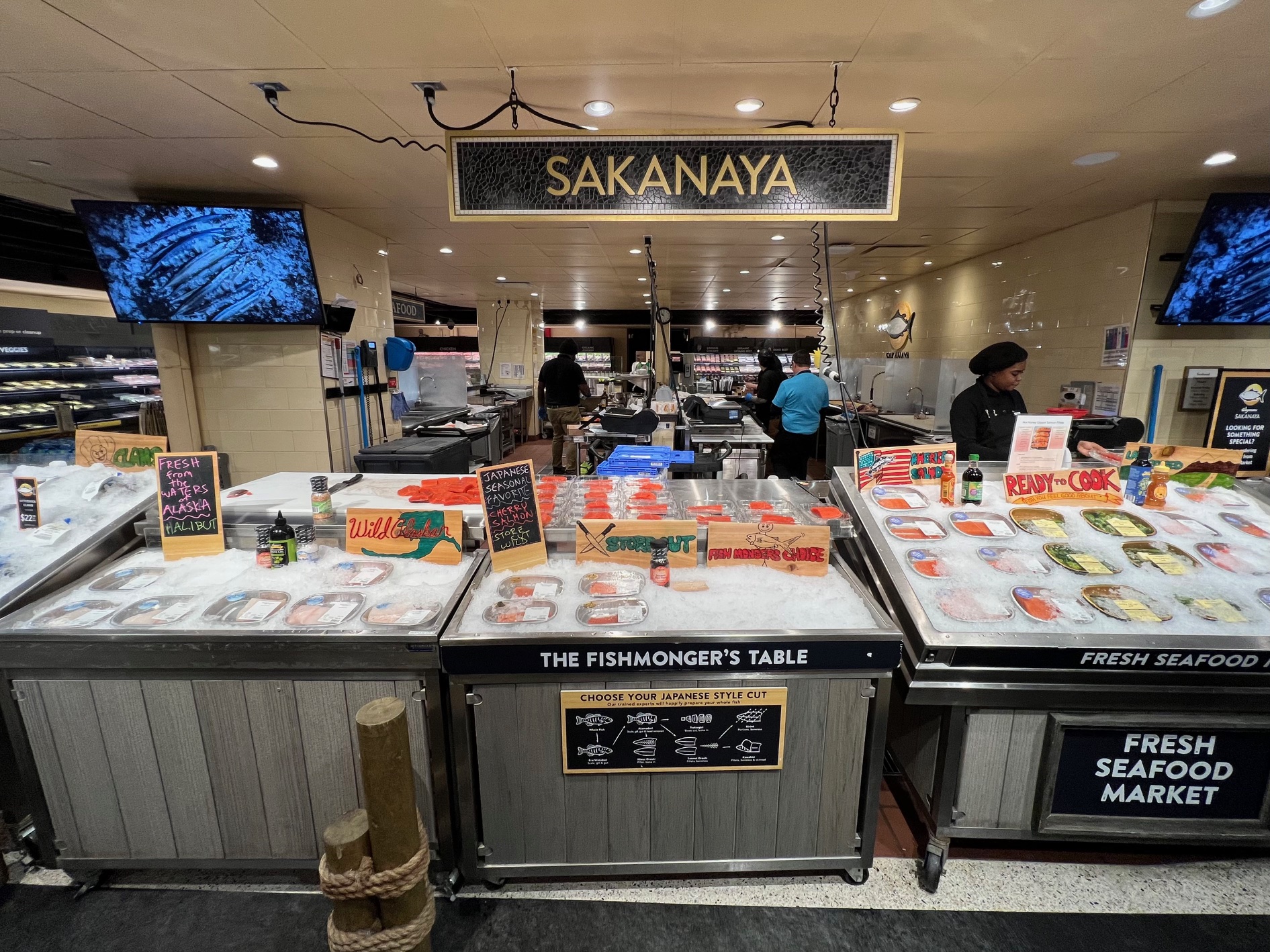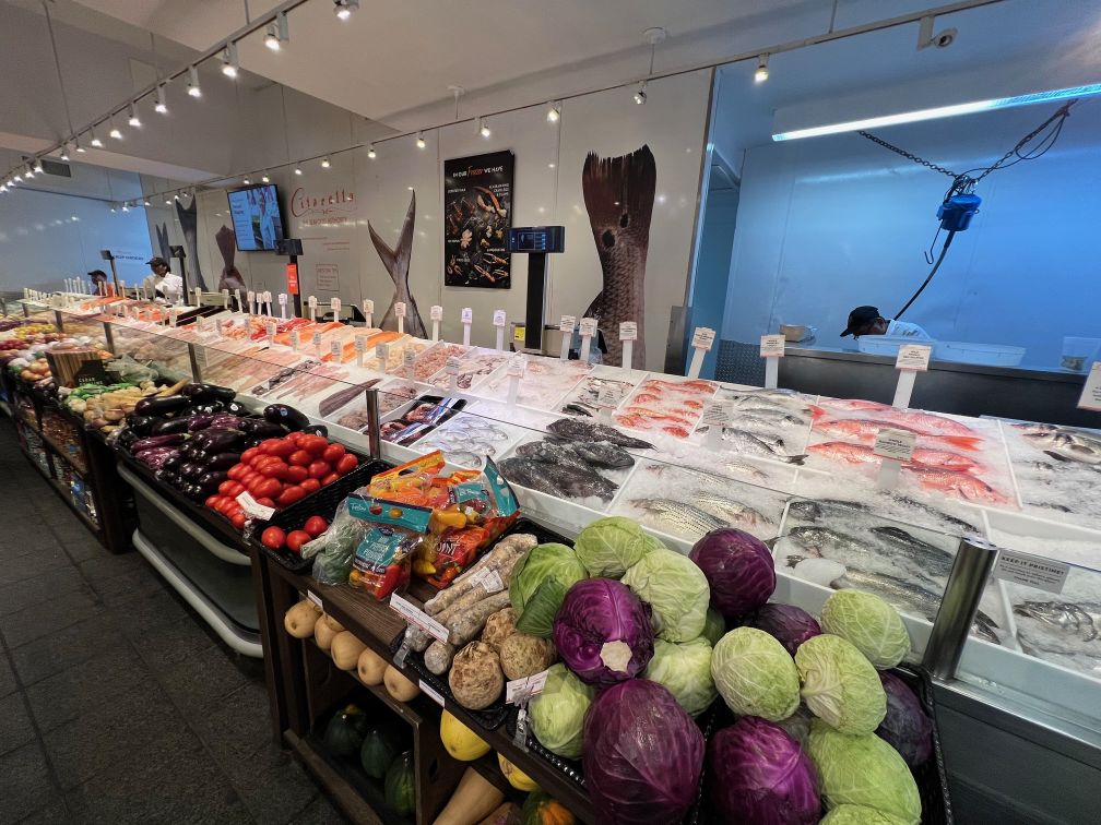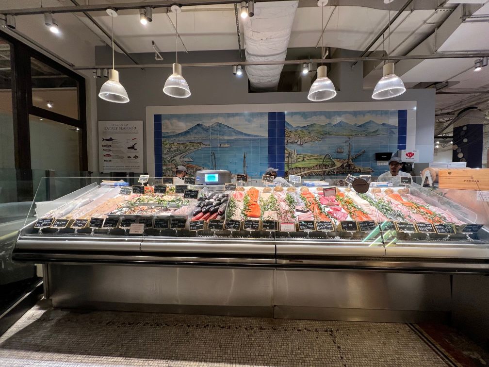 魚の尻尾がデザインされたシーフード売場。