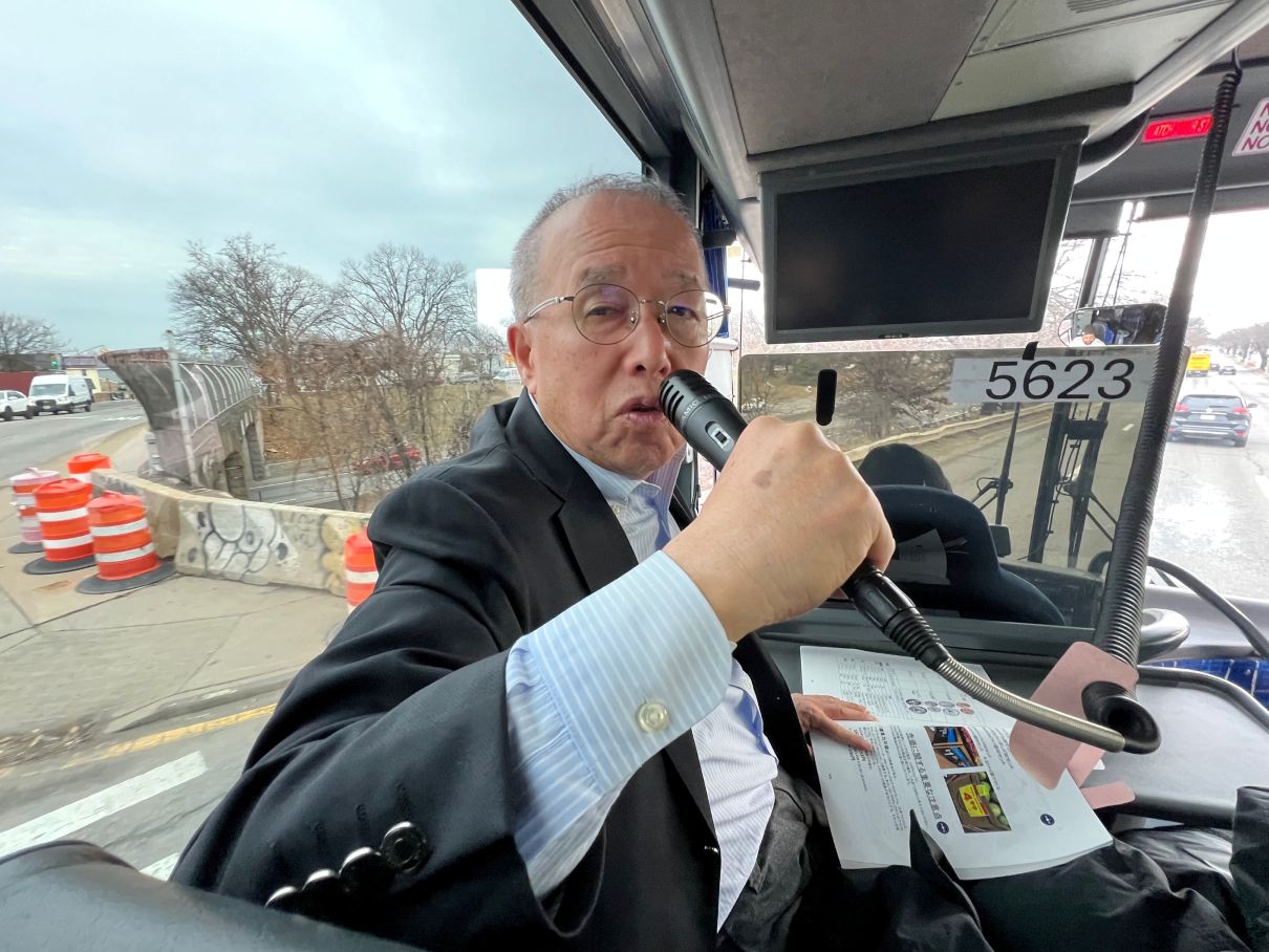 専用バスで視察研修がスタート。